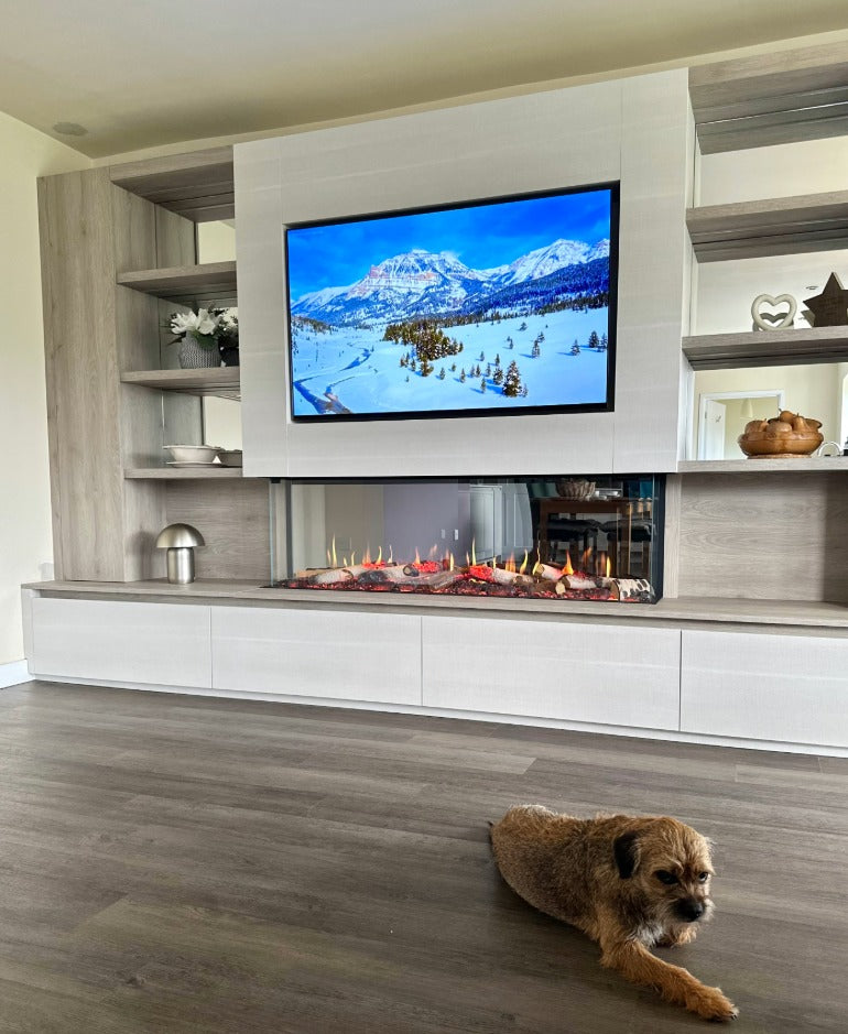 The layout centres around the TV and an elegant electric fire, framed by a combination of cupboards, shelves, and drawers to balance storage and display. This configuration provides ample space for media equipment and decorative pieces while keeping the overall look clean and uncluttered.