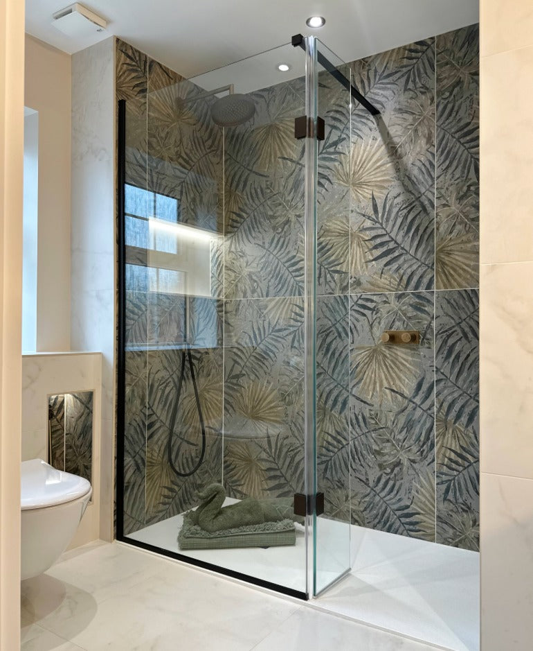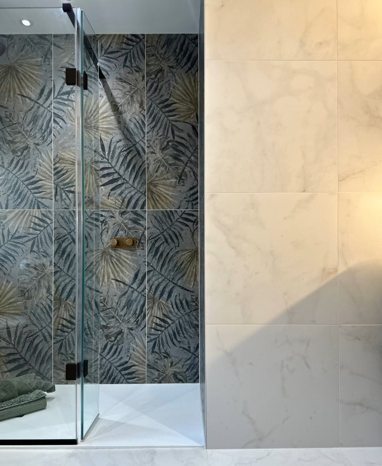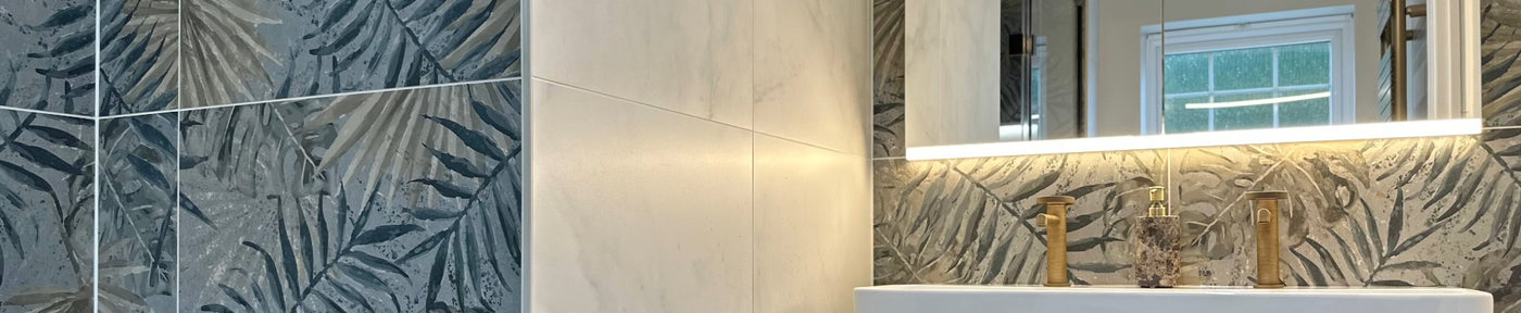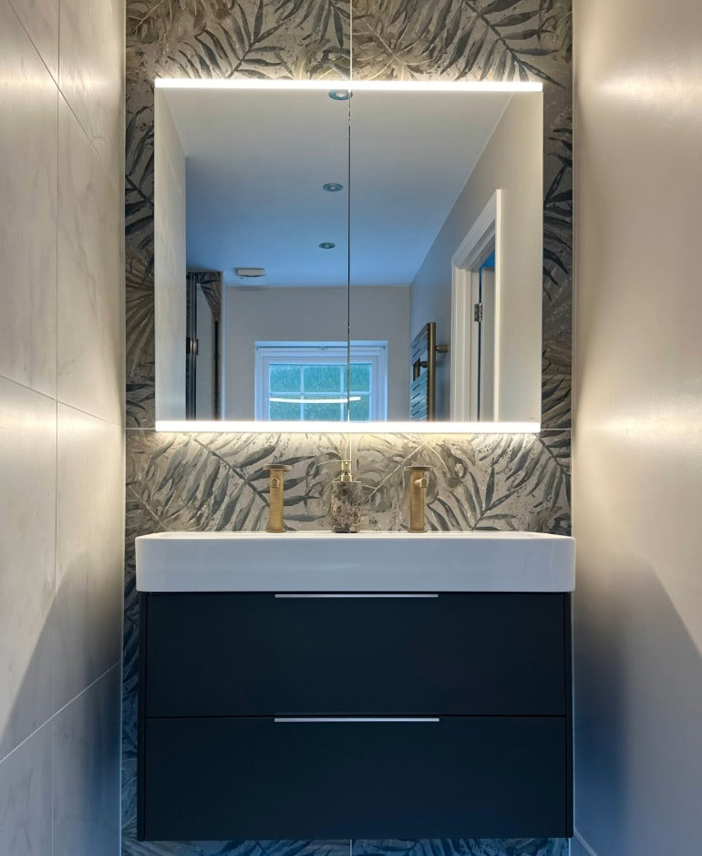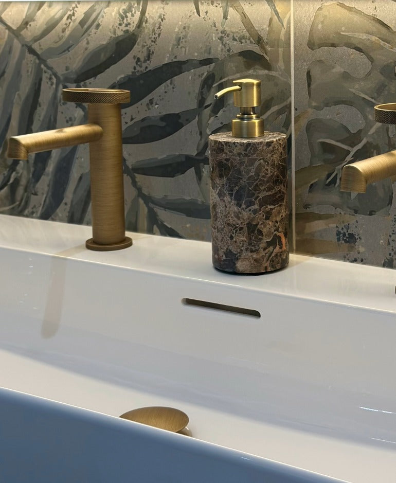 Minoli leaf-patterned tile behind the sink brings in a natural, textured look that feels fresh without being too loud. The Gessi antique brass fixtures add warmth and a touch of luxury.