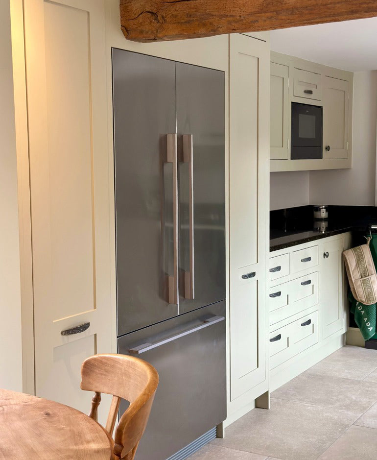 To update the functionality of the space, we introduced a Fisher & Paykel fridge freezer alongside additional larder storage, seamlessly blending new elements into the established layout. In the adjoining dining area, we created a bespoke wine cooler and bar zone, making the room more sociable and practical for entertaining.