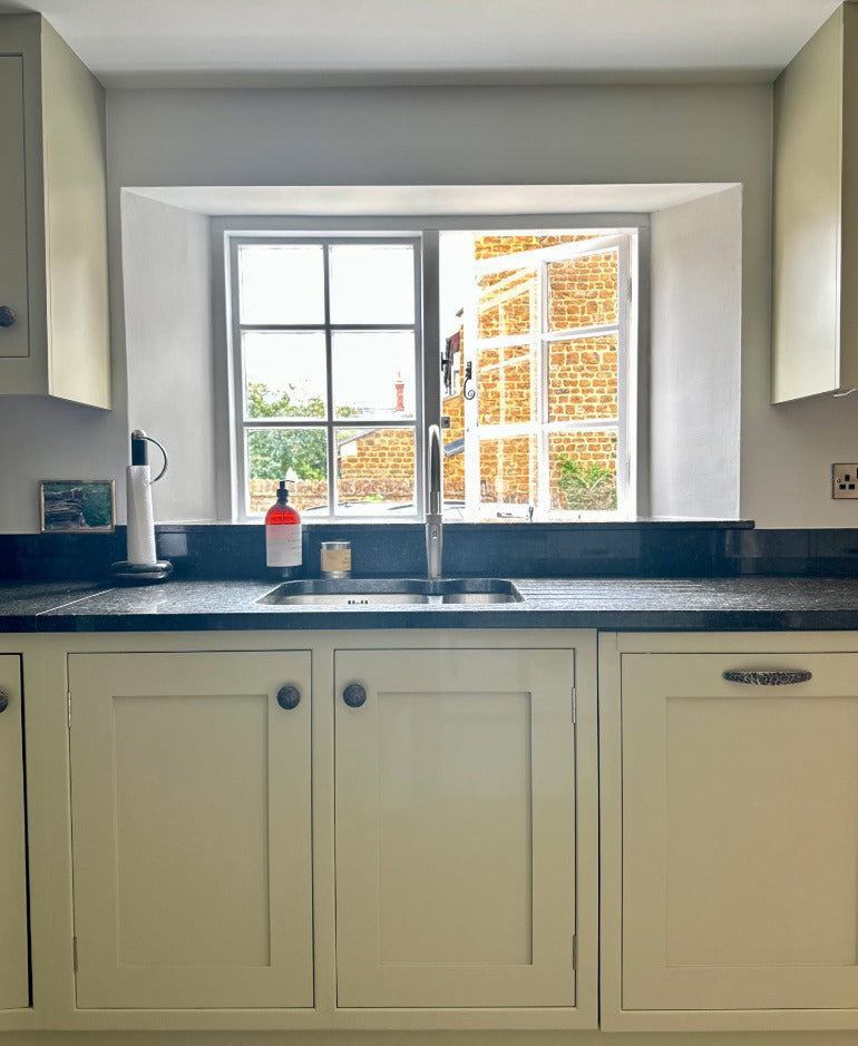 For this project, our client wanted to refresh and enhance their existing kitchen while making the most of the space available. We worked with the original Nicholas Bell in-frame furniture, giving it a new lease of life with a fresh coat of paint in Conival (matched to Little Greene’s Book Room Green in Benjamin Moore Scuff-X). This soft yet characterful shade transformed the cabinetry, creating a warm and timeless look.