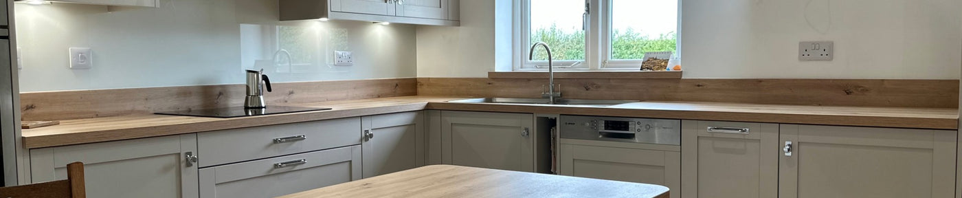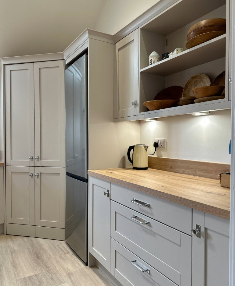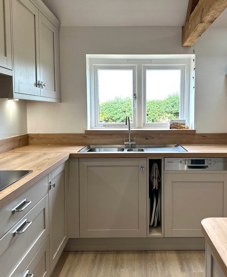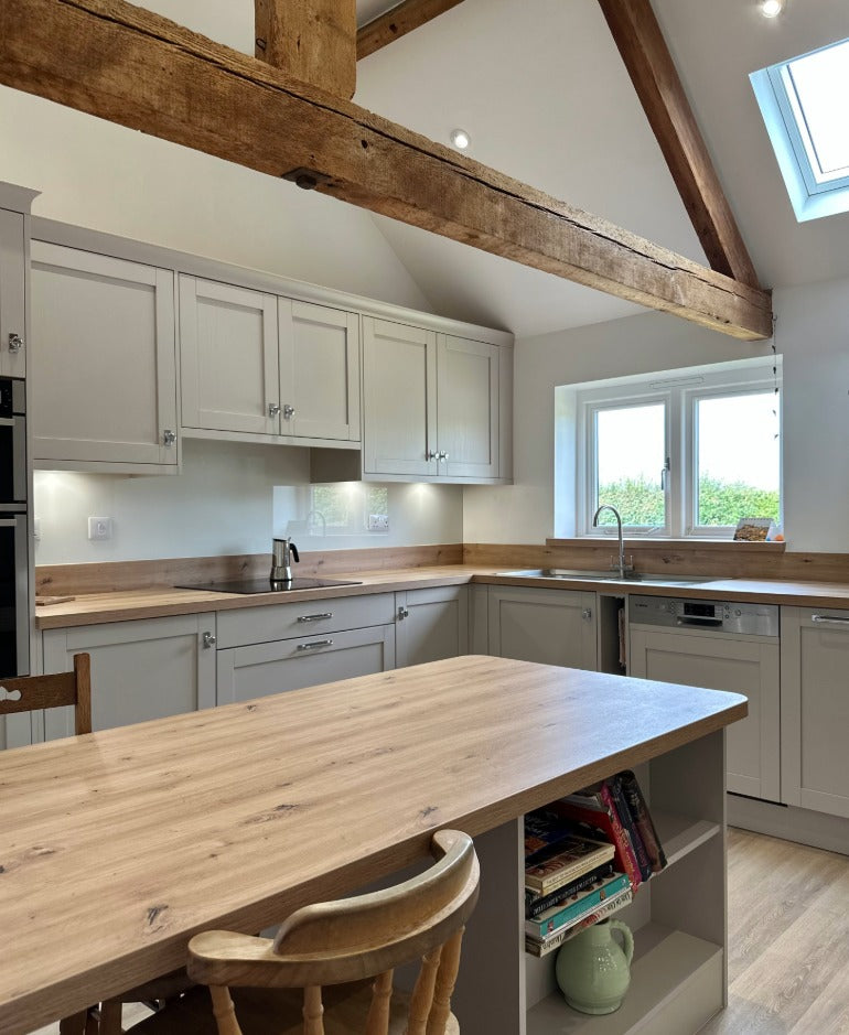 The wood-effect laminate worktop with matching upstands complements the surrounding oak beams, tying the room together and reinforcing its relaxed, country feel. A bespoke corner pantry adds smart storage and easy access to baking essentials, helping to keep the space organised and efficient.