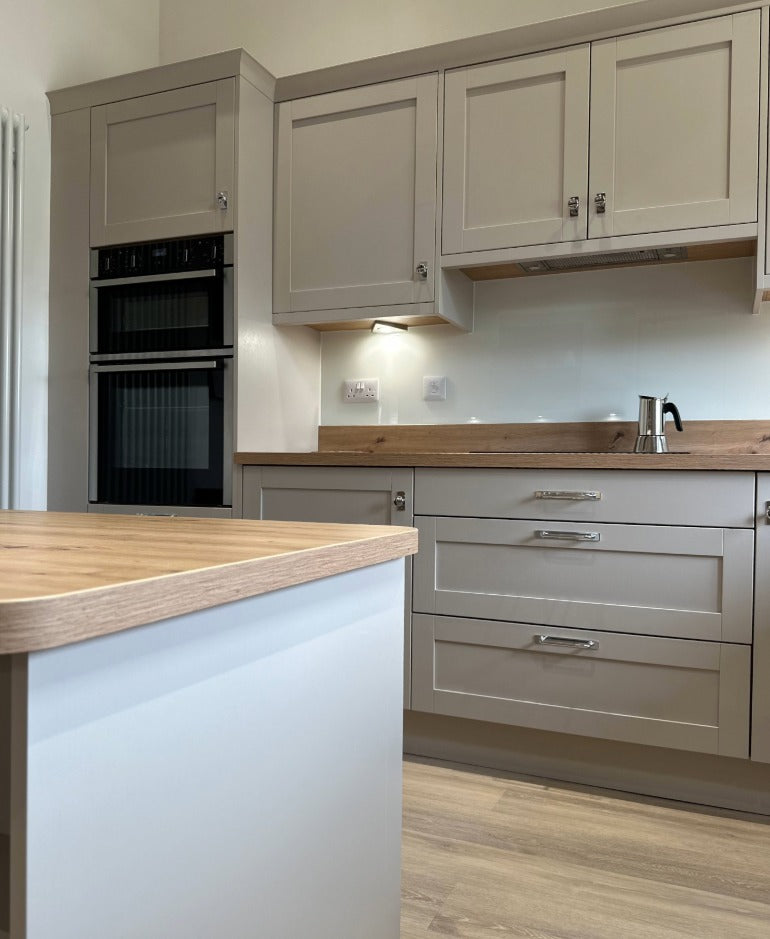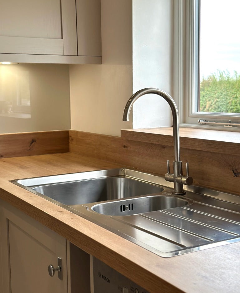 For this project, our client wanted a warm and welcoming kitchen that felt timeless, practical, and full of character. We designed the space using Mackintosh furniture in the selected door style of Sovereign, painted in Cashmere, a soft neutral that complements the medium oak carcases beautifully. The combination creates a gentle contrast and enhances the kitchen’s classic shaker aesthetic.