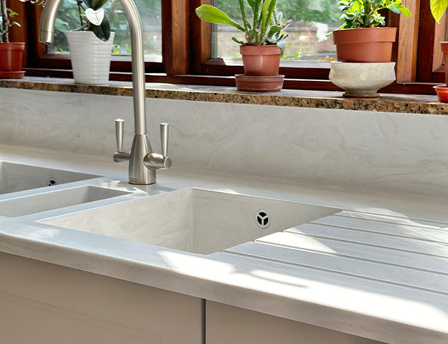 Corian Solid Surface is perfect for a range of kitchen styles, from high tech to traditional, from minimalist to warm and cosy. Offering extraordinary design flexibility in a wide range of vibrant colours, it is ideal for countertops, backsplashes and integrated sinks, and many other applications. It offers inconspicuous seams and a sleek, hygienic non-porous surface. Its warm-to-the-touch feeling immediately inspires confidence and reliability. And rightly so, as Corian® is easy to clean, easy to care for and easy to live with!