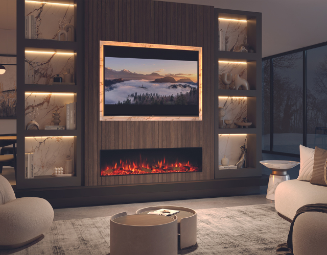 Each eStudio electric fire is equipped with vibrant Chromalight® up-lighting and multiple flame effects, allowing you to create the perfect ambiance. For those seeking an enhanced experience, the optional LED Mood Lighting System offers 13 Chromalight® colours, fully controllable via the remote handset. Ideal for media wall installations, this feature adds a personalised touch, making the eStudio the centrepiece of any modern home.