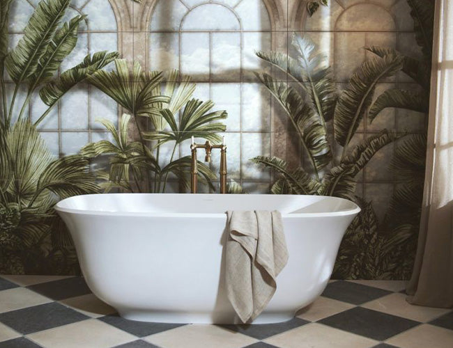 A refined, monochrome version of our popular Tropical Oasis mural, offering a subtler take on the lush, tropical atmosphere. Our stunning 'panoramic' Murals are ideal for those looking to make a dramatic statement. Each mural is designed in three seamless panels that can be displayed individually, or combined to create the ultimate immersive look. Shown here is Panel A.