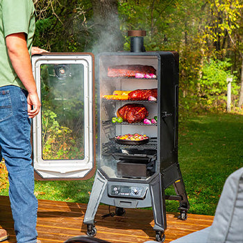 In addition to grilling, the Memphis Ultimate 2.0 includes a 1,500-watt electric smoker with a glass door and cold smoking capabilities. Smoke a 20-pound turkey or use the three racks to cold smoke cheese, all while keeping an eye on your food through the glass door. The newly redesigned model also allows for faster assembly, so you can start cooking sooner. With added features like tool hooks, steel side shelves, and locking caster wheels for easy mobility, the Memphis Ultimate 2.0 is the all-in-one solution for any backyard chef.