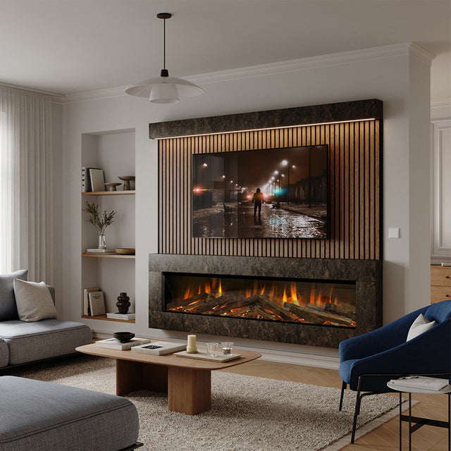 The Evonic E-lectra 1800 Black Edition represents the pinnacle of contemporary electric fire design, uniting cutting-edge innovation with an impressively wide and dramatic aesthetic. Showcasing advanced LED illumination, this commanding model delivers an exceptionally immersive flame display, beautifully intensified by its signature black rear screen that enhances depth, colour, and visual clarity. Bold, elegant, and atmospheric, the E-lectra 1800 becomes an unforgettable statement piece in any modern home.